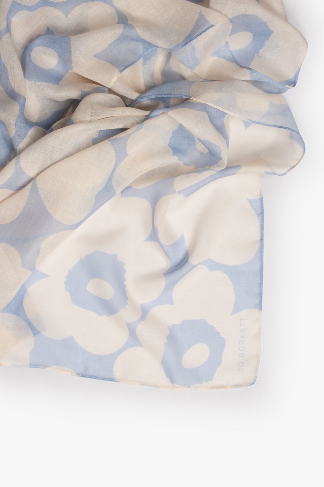 Elevate your ensemble with this delicate voile scarf in soft powder blue and cream. Featuring a bold, playful floral motif, it effortlessly blends subtle elegance with a touch of artistic charm. Lightweight and breathable, this scarf adds refined grace to any outfit while providing a gentle, comfortable drape.