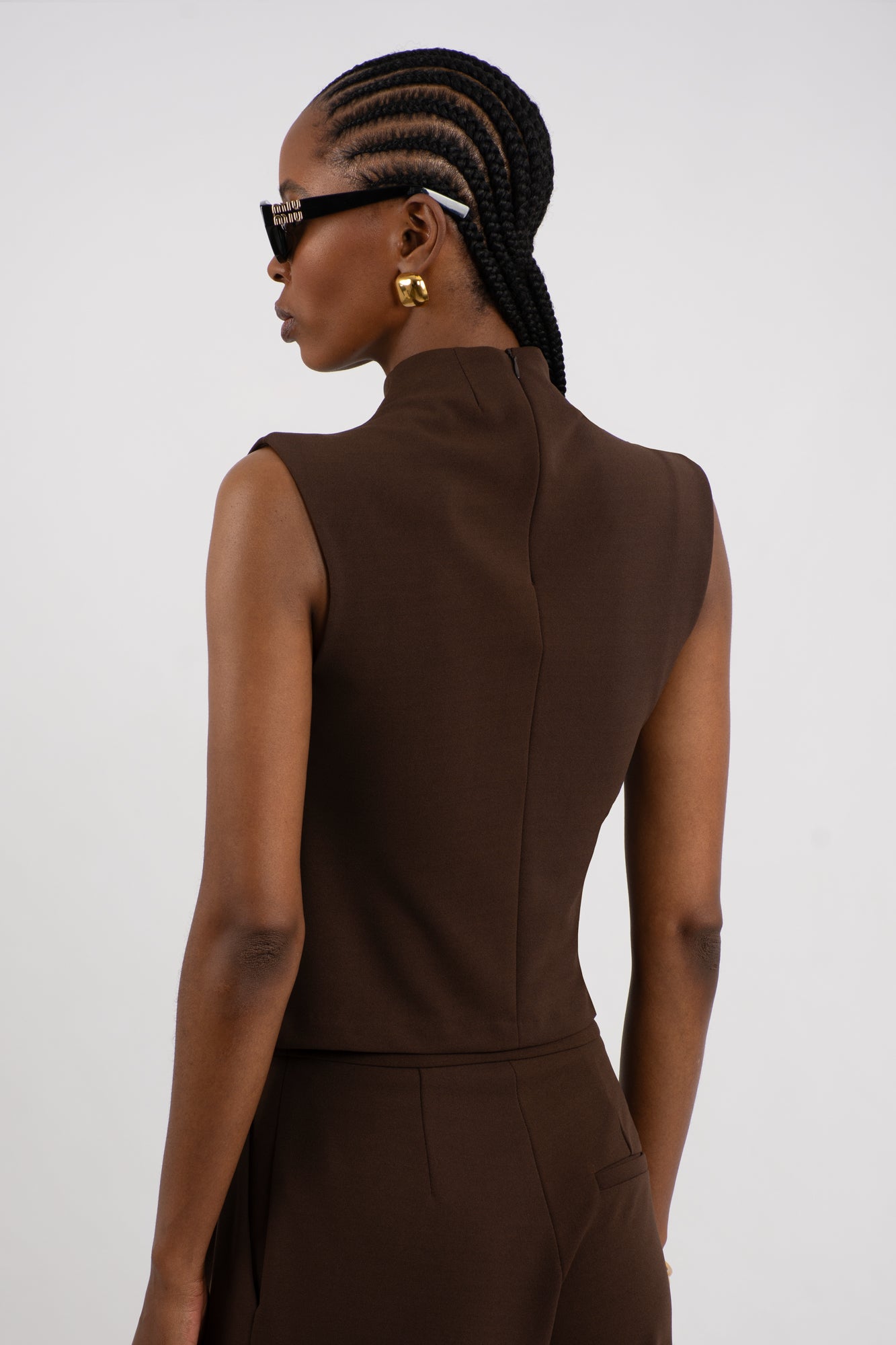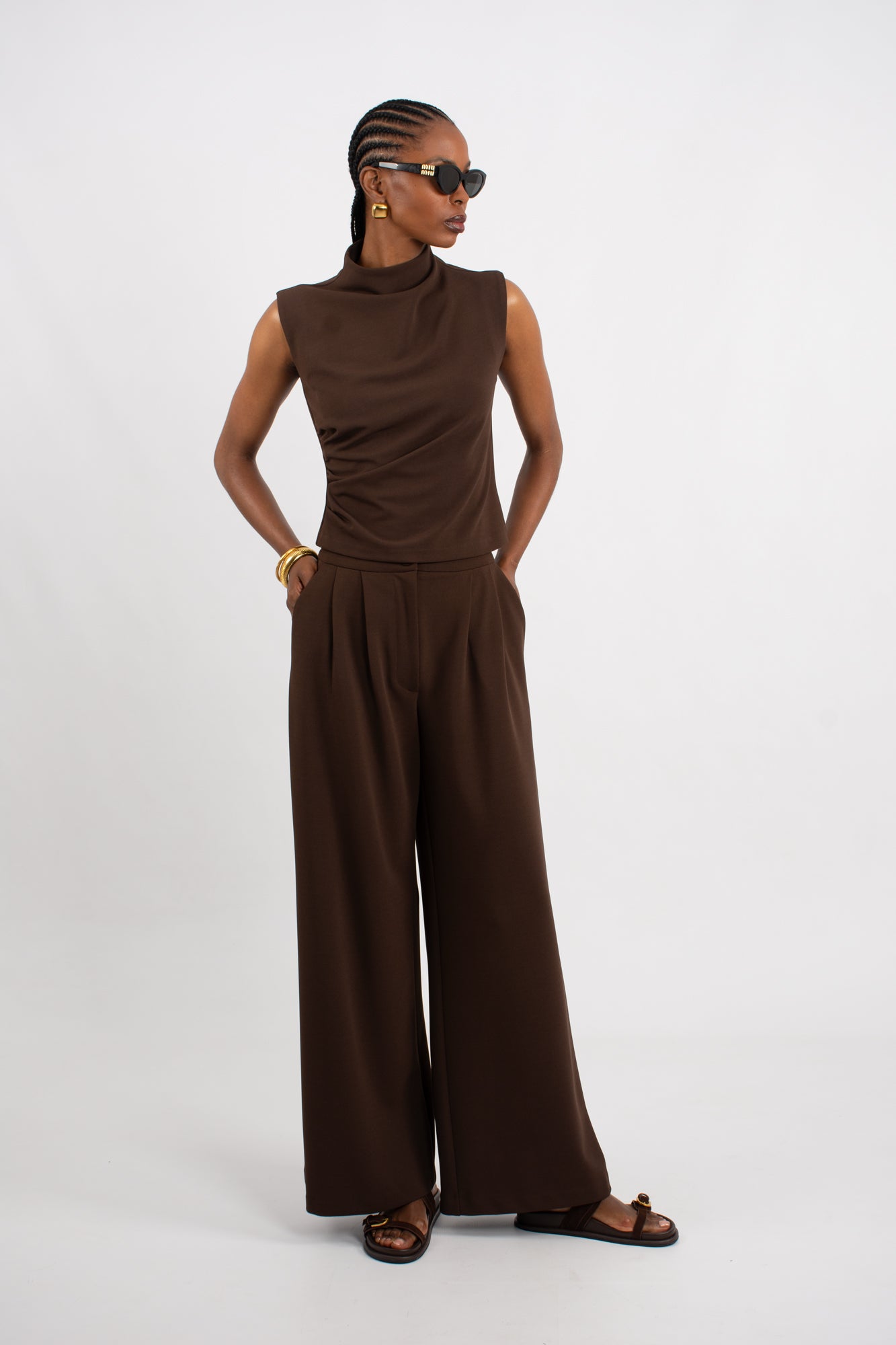 The sleeveless design features distinctive wide shoulder and refined pleating detail on the left front, while a concealed back zip ensures a seamless silhouette.