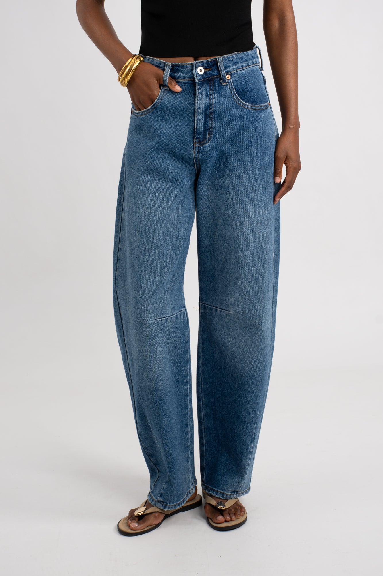 Effortlessly chic and undeniably versatile, these mid-rise barrel leg jeans deliver contemporary style with timeless appeal.