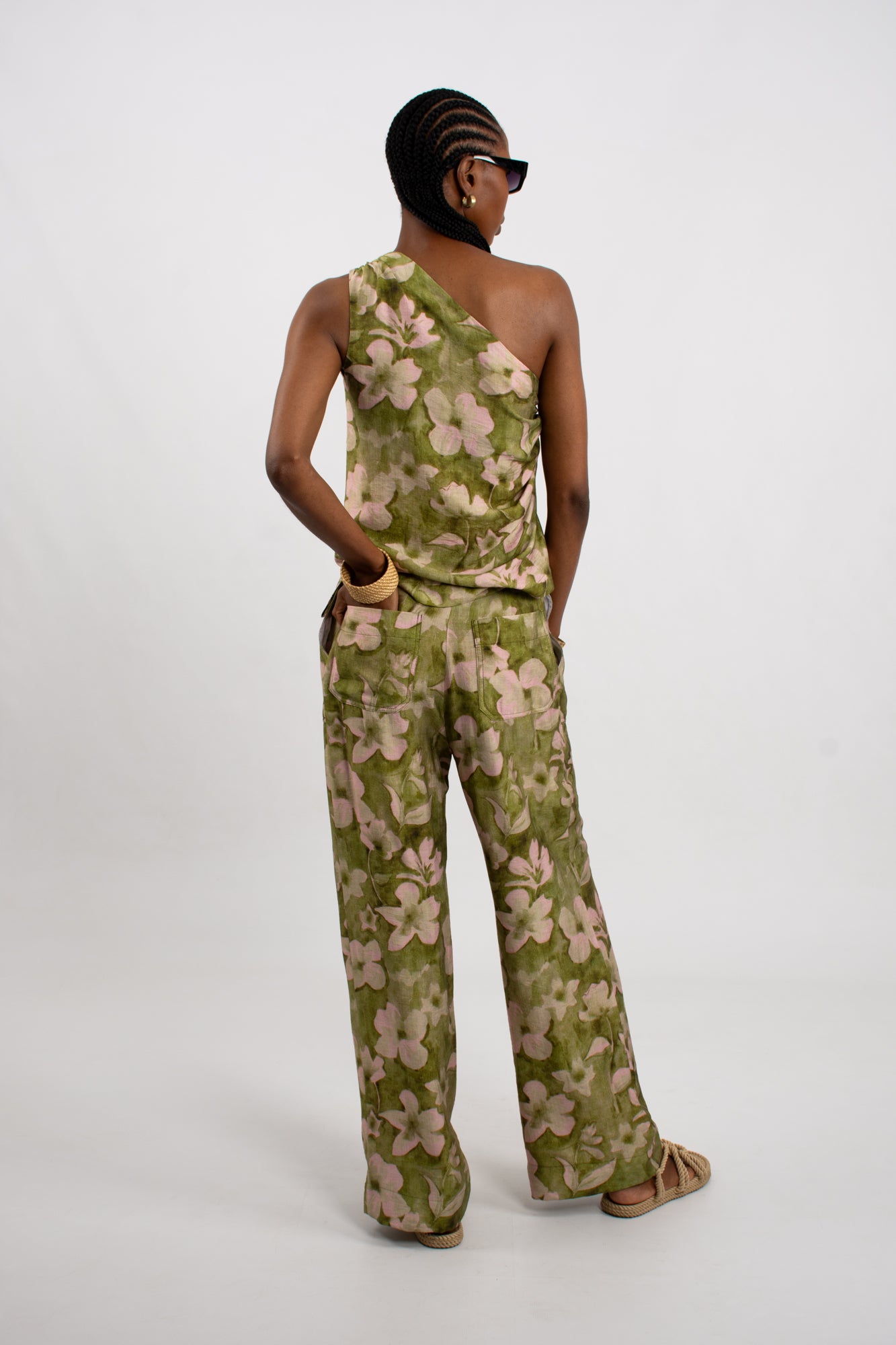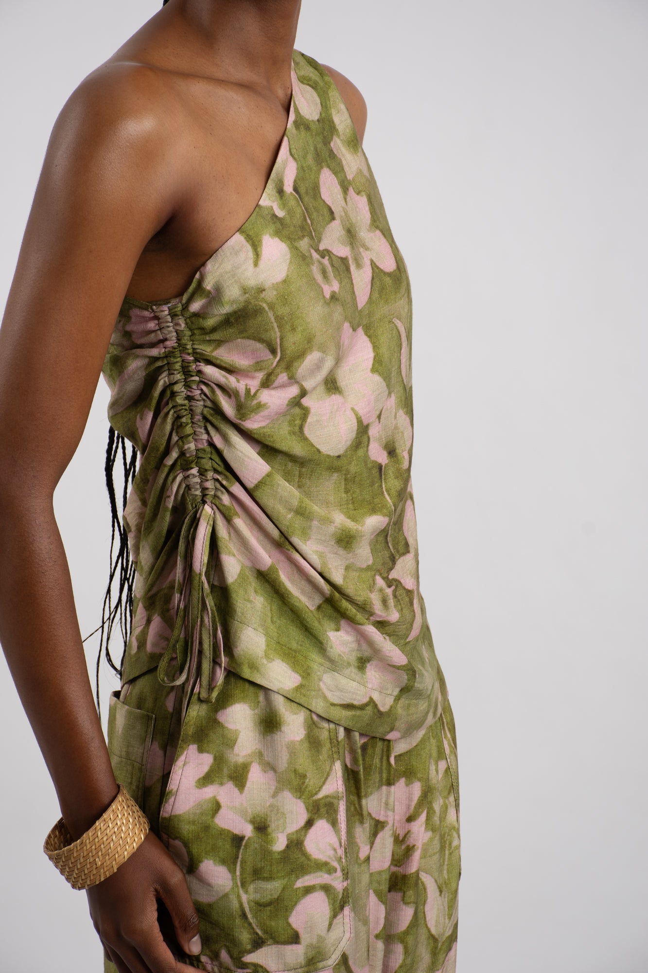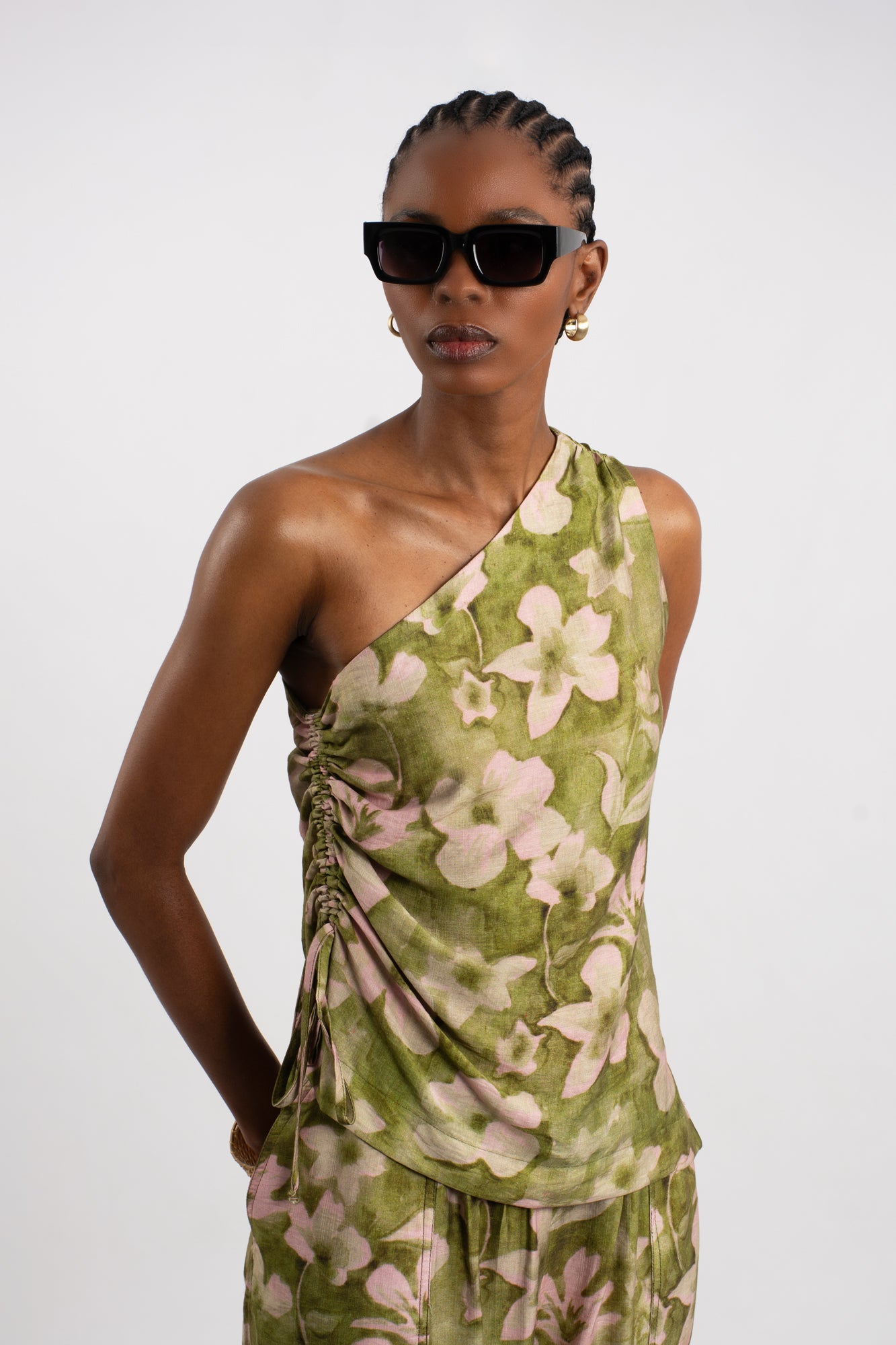 Elevate your wardrobe with this striking one-shoulder viscose top, featuring an abstract custom-designed print in sophisticated tones of olive, sage green, and soft blush pink. The relaxed silhouette is refined with ruching along the side seam, creating gentle dimension and flattering movement.