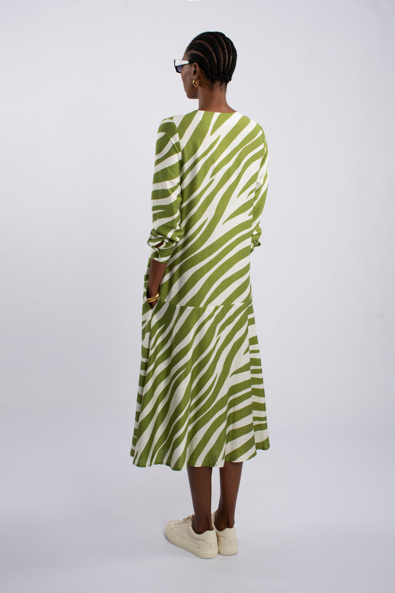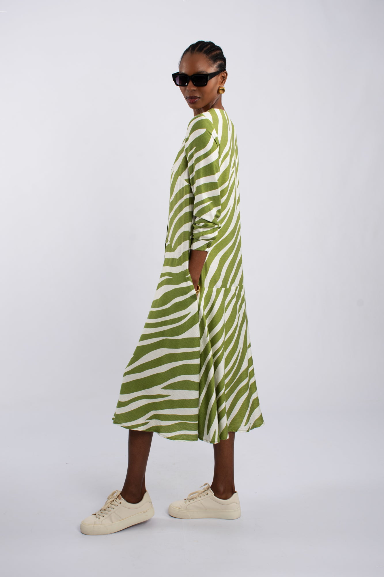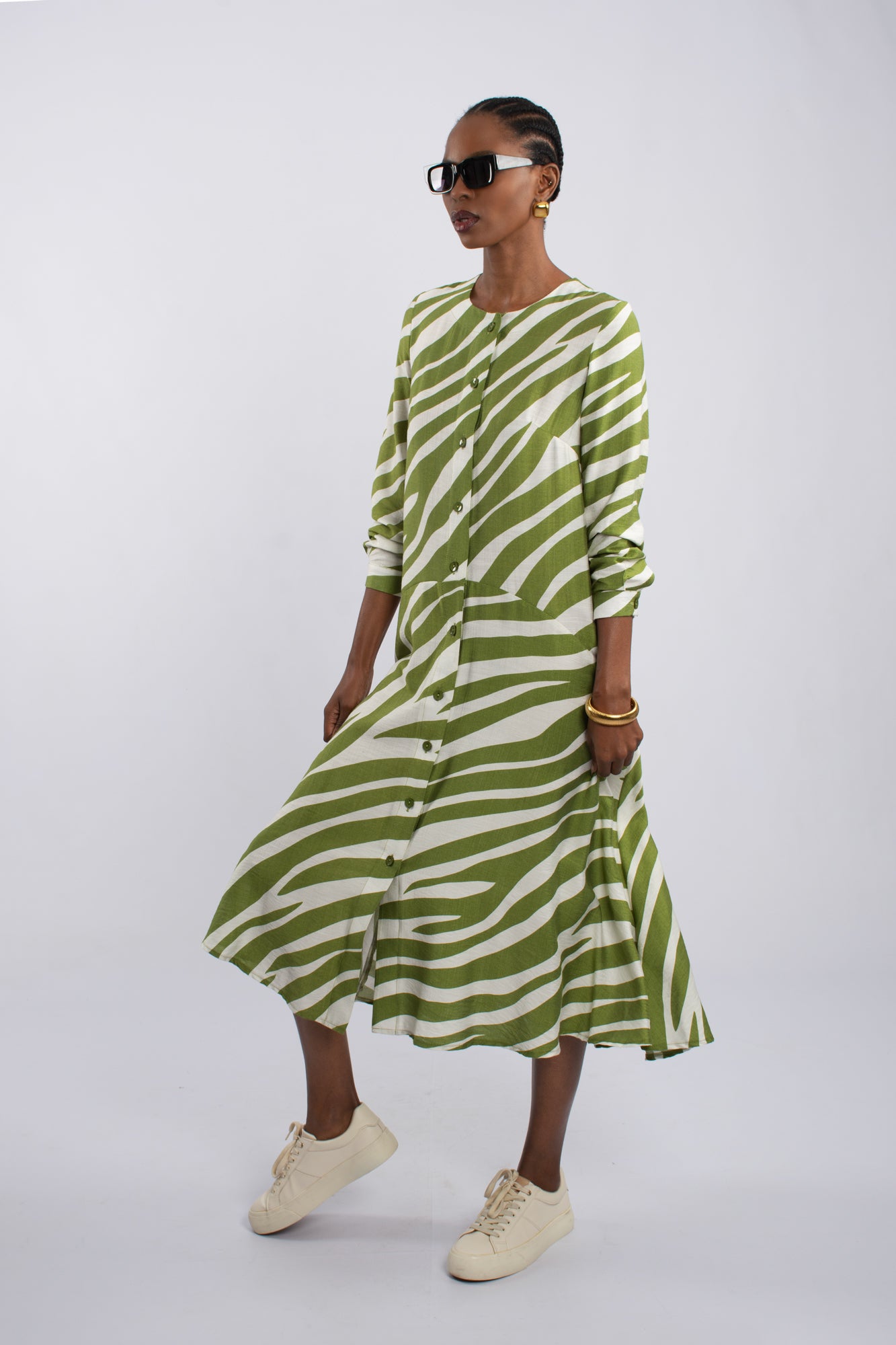 This stunning Loose Midi Dress features a dropped waist and front button stand, creating a flattering and effortless shirt dress style. Its lime green enlarged zebra print adds a touch of boldness and playfulness to any outfit. Embrace comfort and style with this must-have piece.