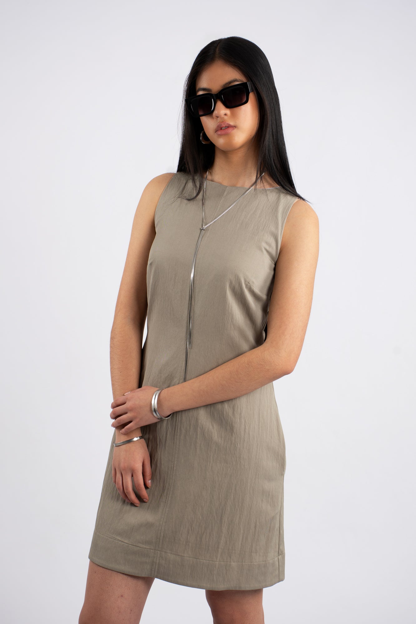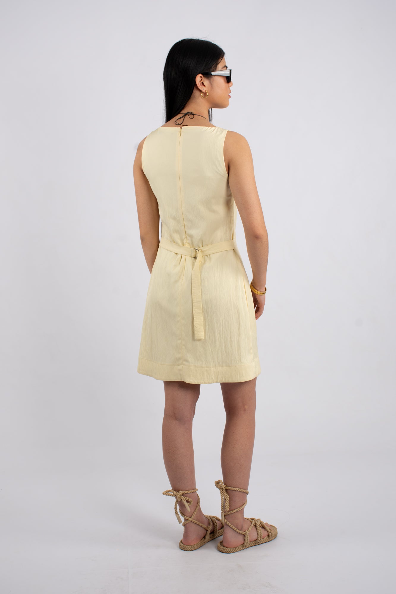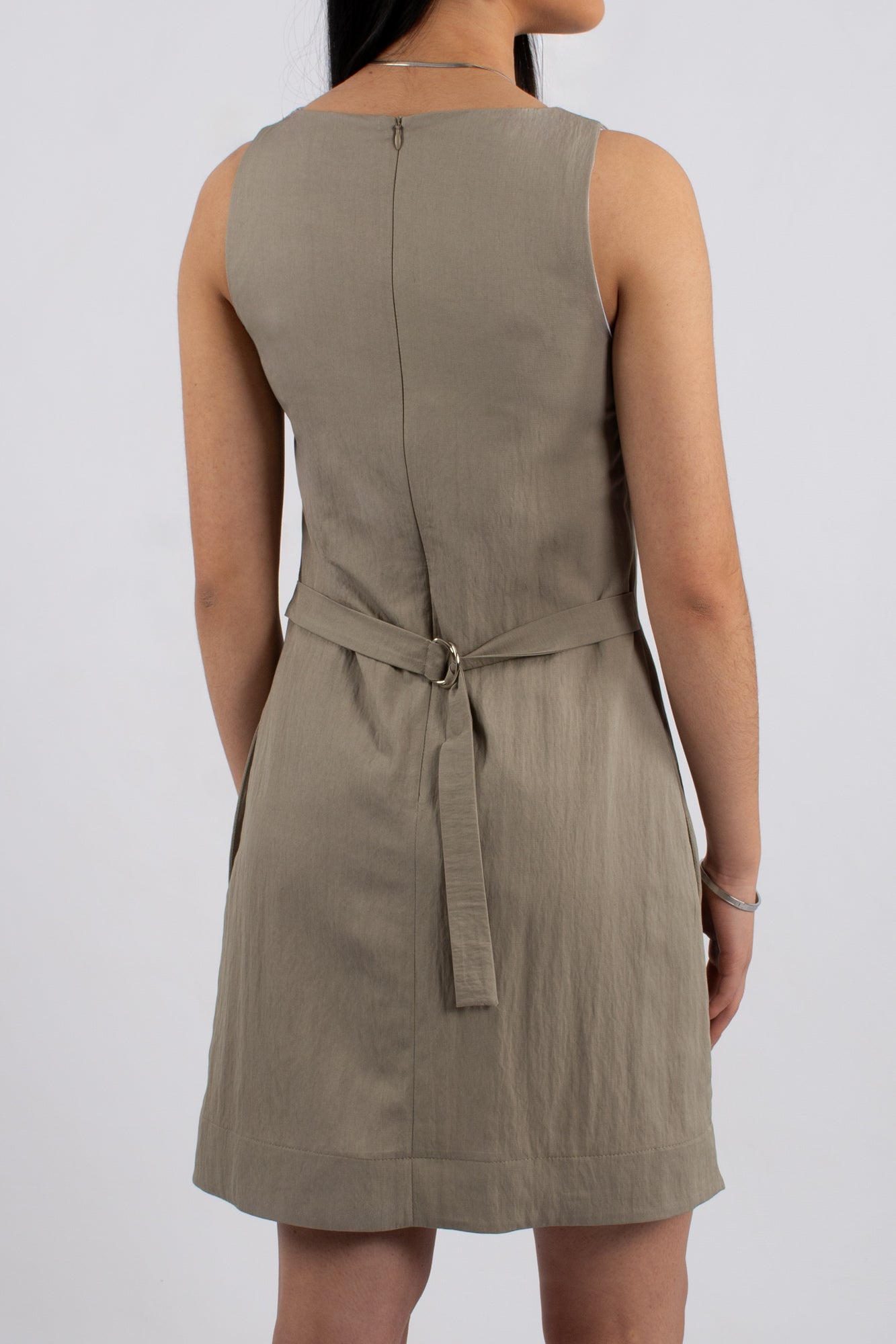 This sleeveless belted mini dress features a classic shift silhouette with a high neckline, creating an elegant and refined look.