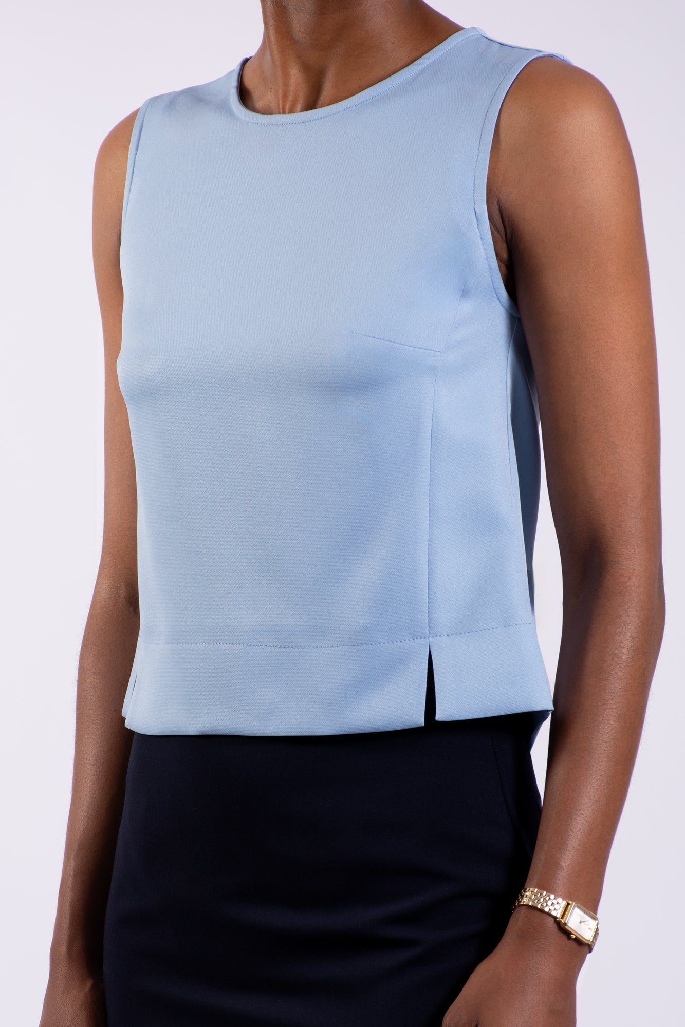 Sleeveless shell top with openended exposed silver metal zip. Princess side seams are brought forward to end in slit at hem.