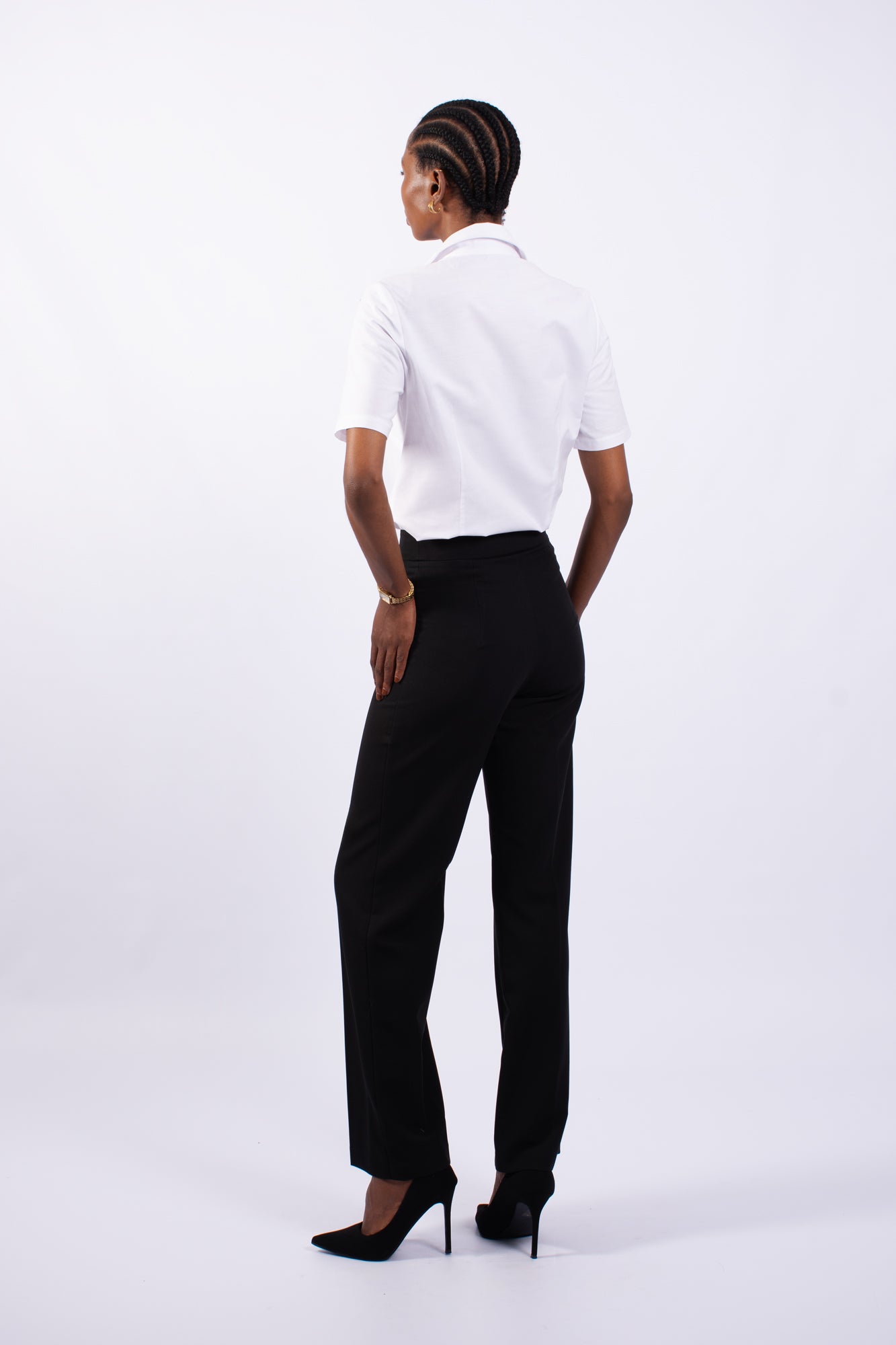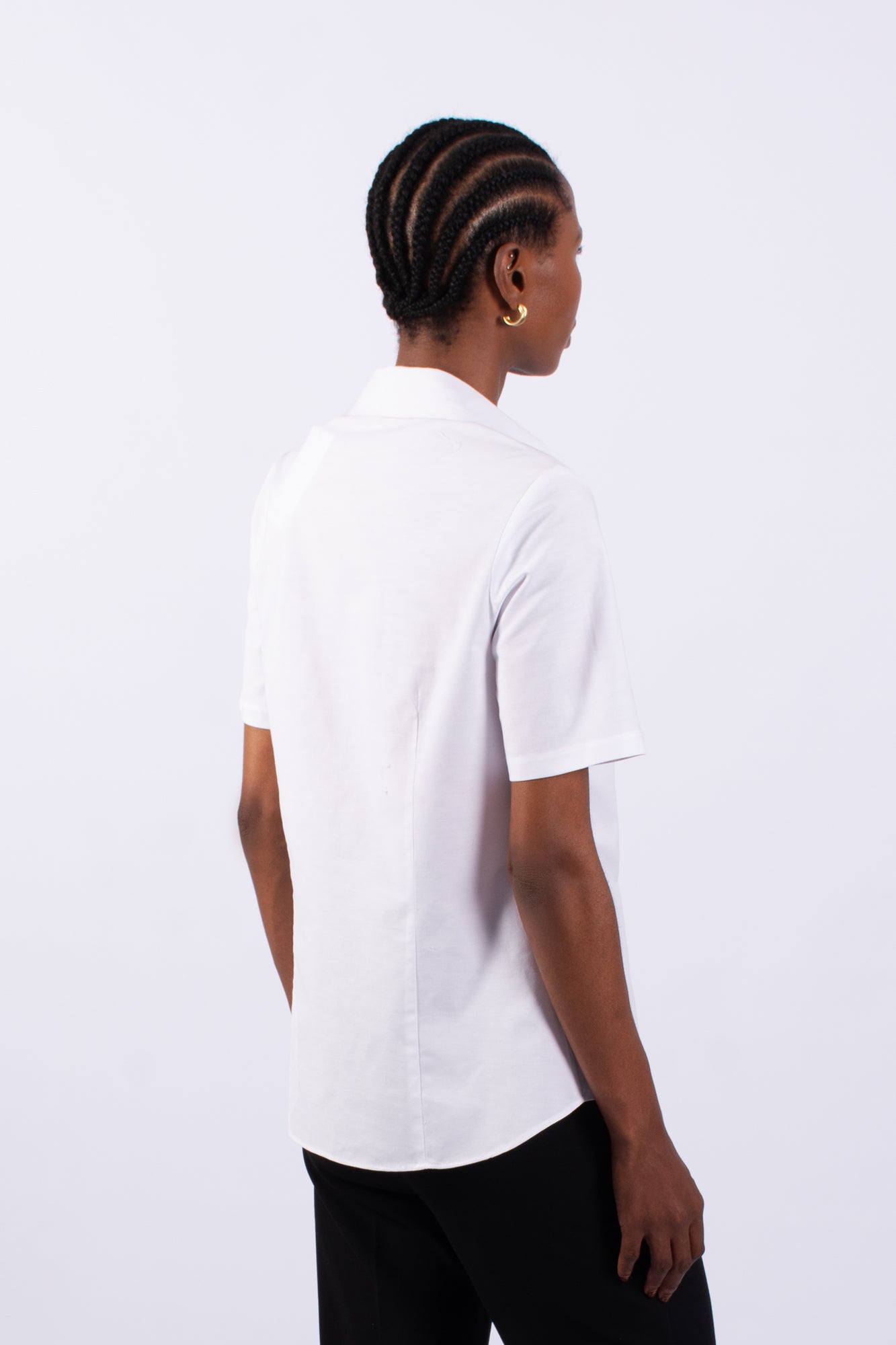 Ladies blouse with cut away front neckline allowing collar to lie open naturally. Blouse has button-stand and short sleeves.
