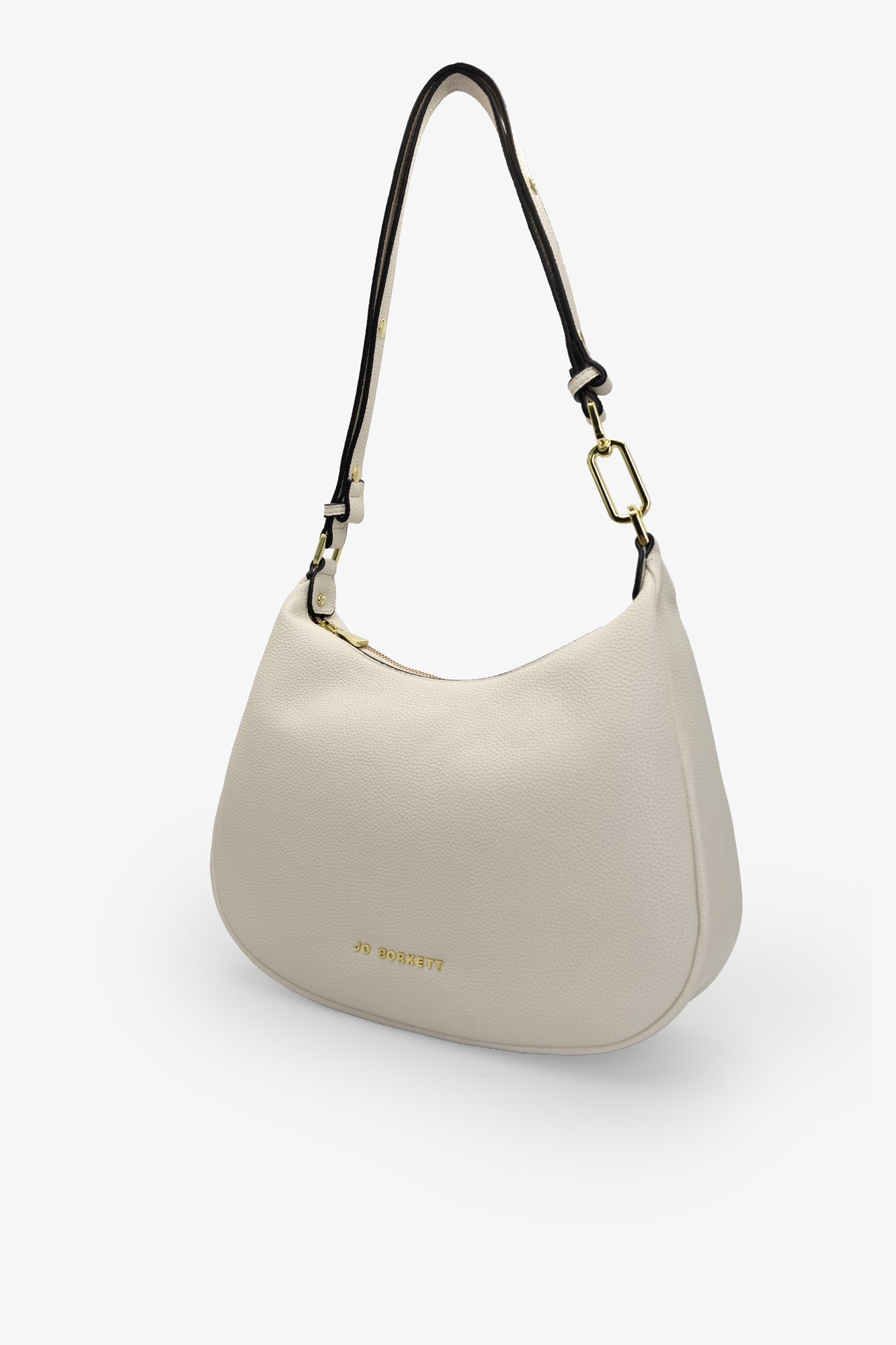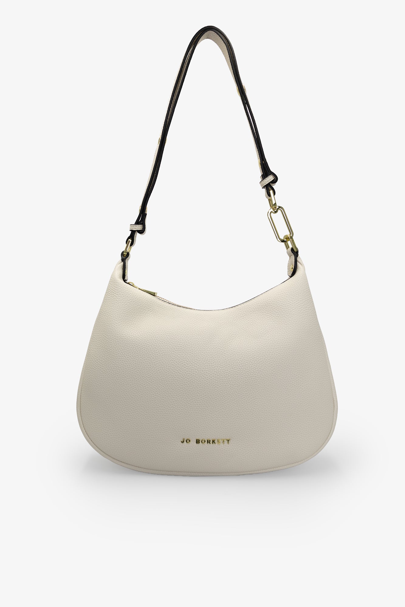 Versatile cream pleather bag featuring a textured pebbled finish and adjustable straps for cross-body or shoulder wear.