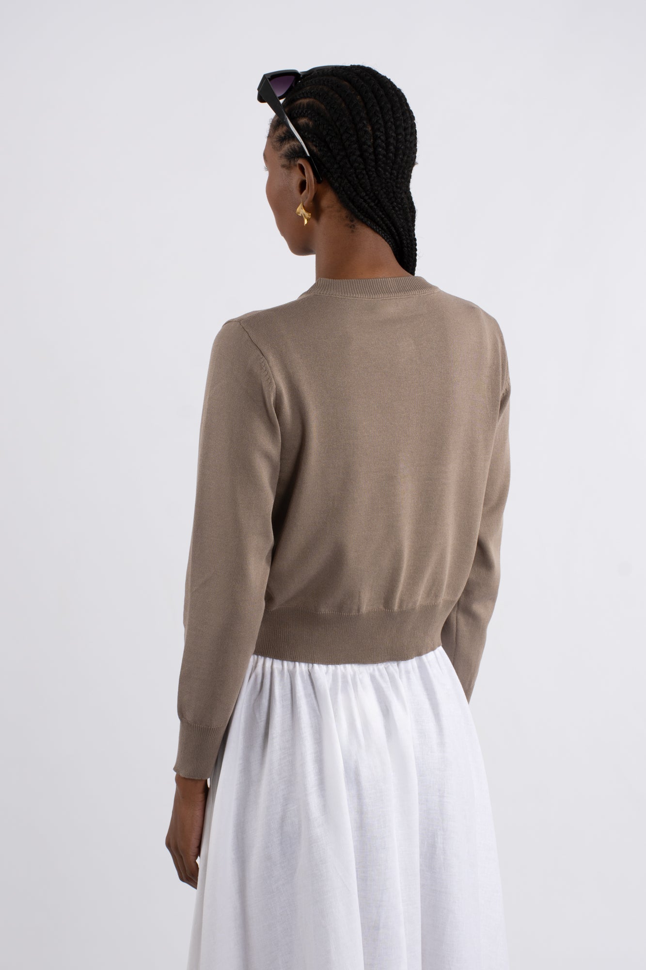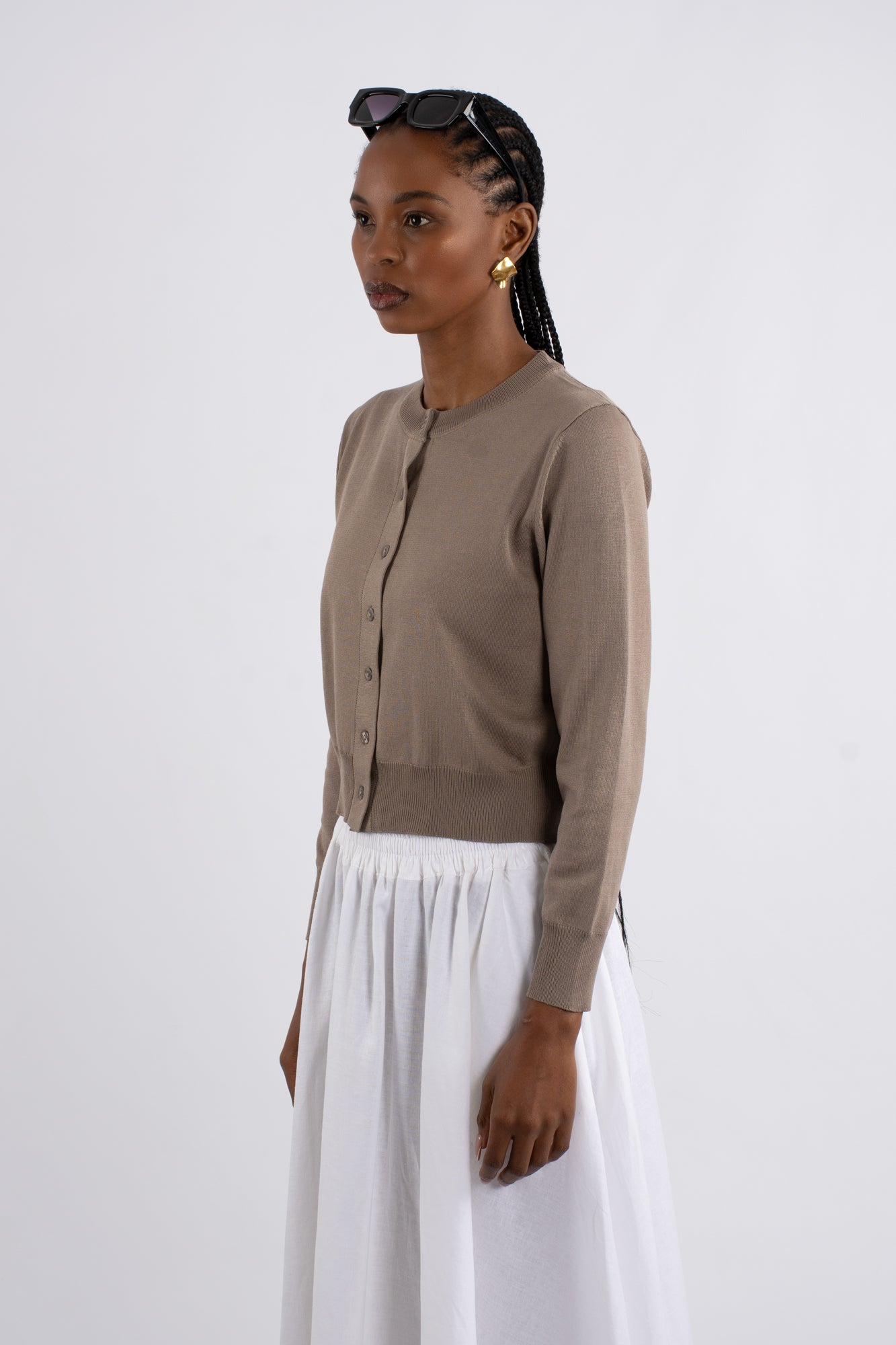 Elevate your everyday wardrobe with this classic crew neck cardigan in Mink. Crafted for seamless layering, its timeless design offers both comfort and understated elegance, making it the perfect choice for transitional days. Whether paired with casual or refined outfits, this plain knit cardigan adds a sophisticated touch to your look.