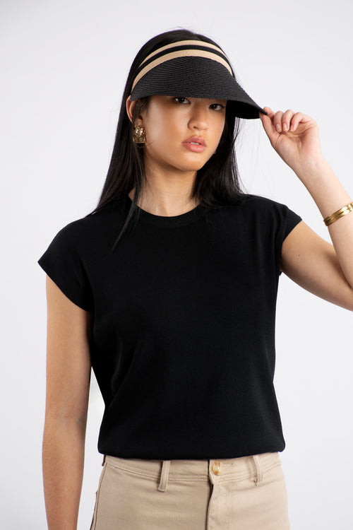 Crew Neck Cap Sleeve Knit T-Shirt - Black