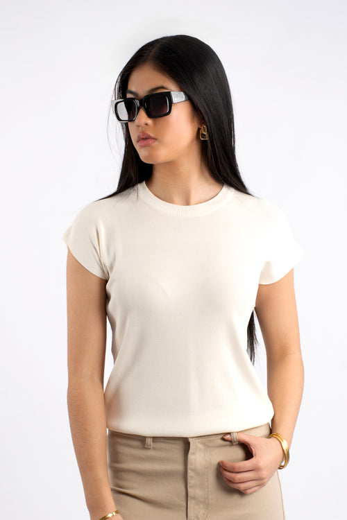 Crew Neck Cap Sleeve Knit T-Shirt - Cream