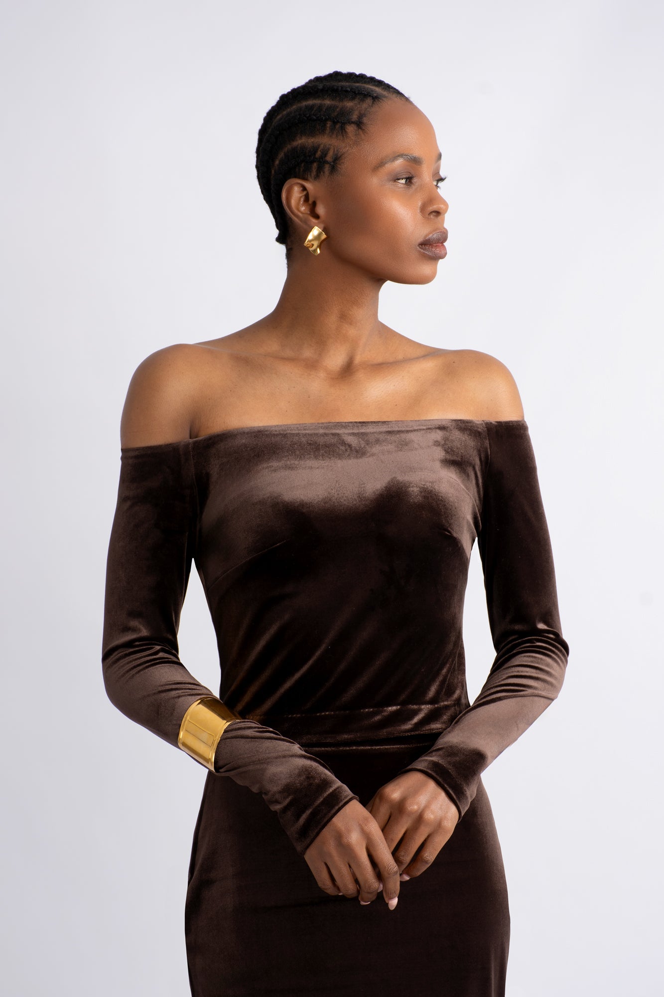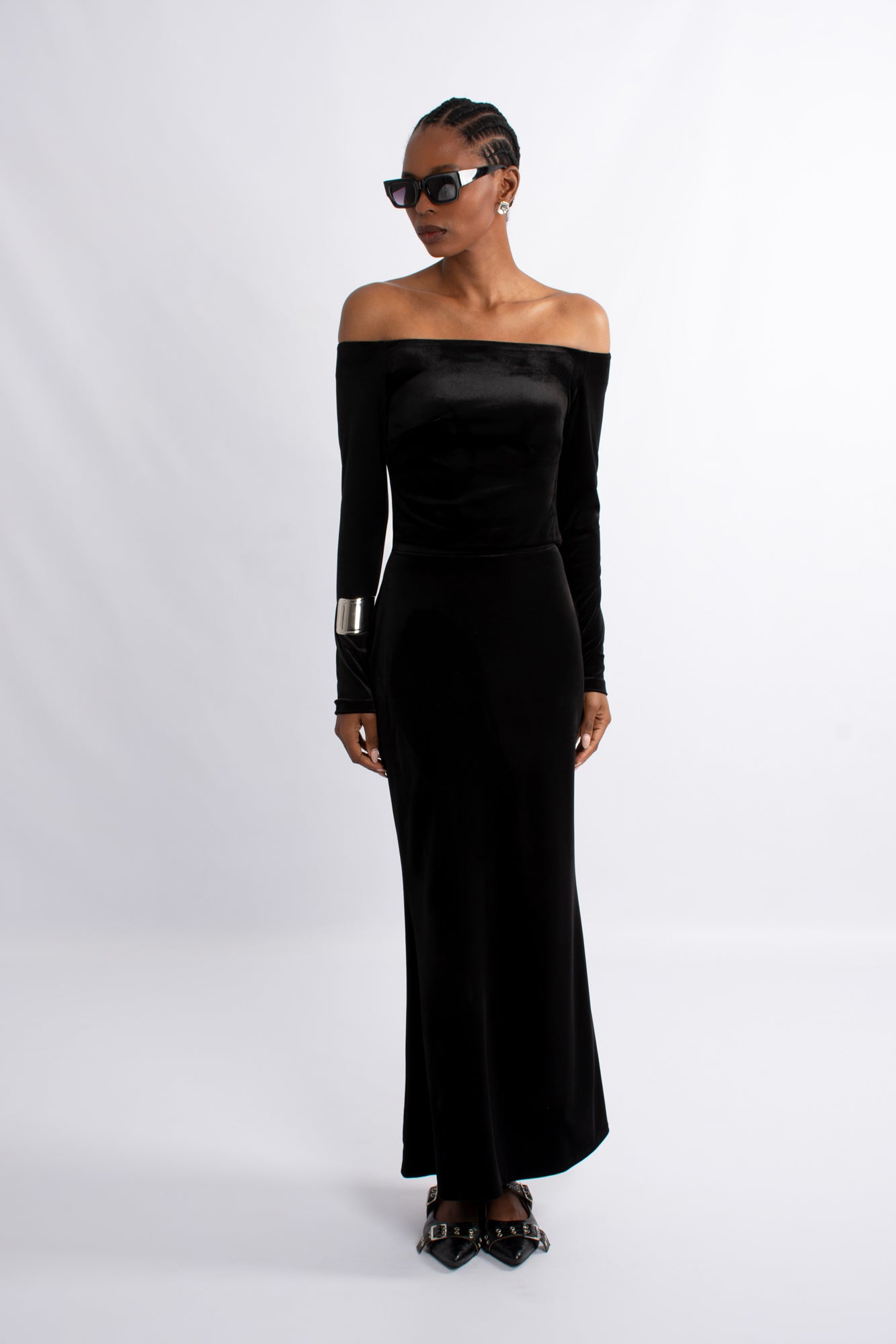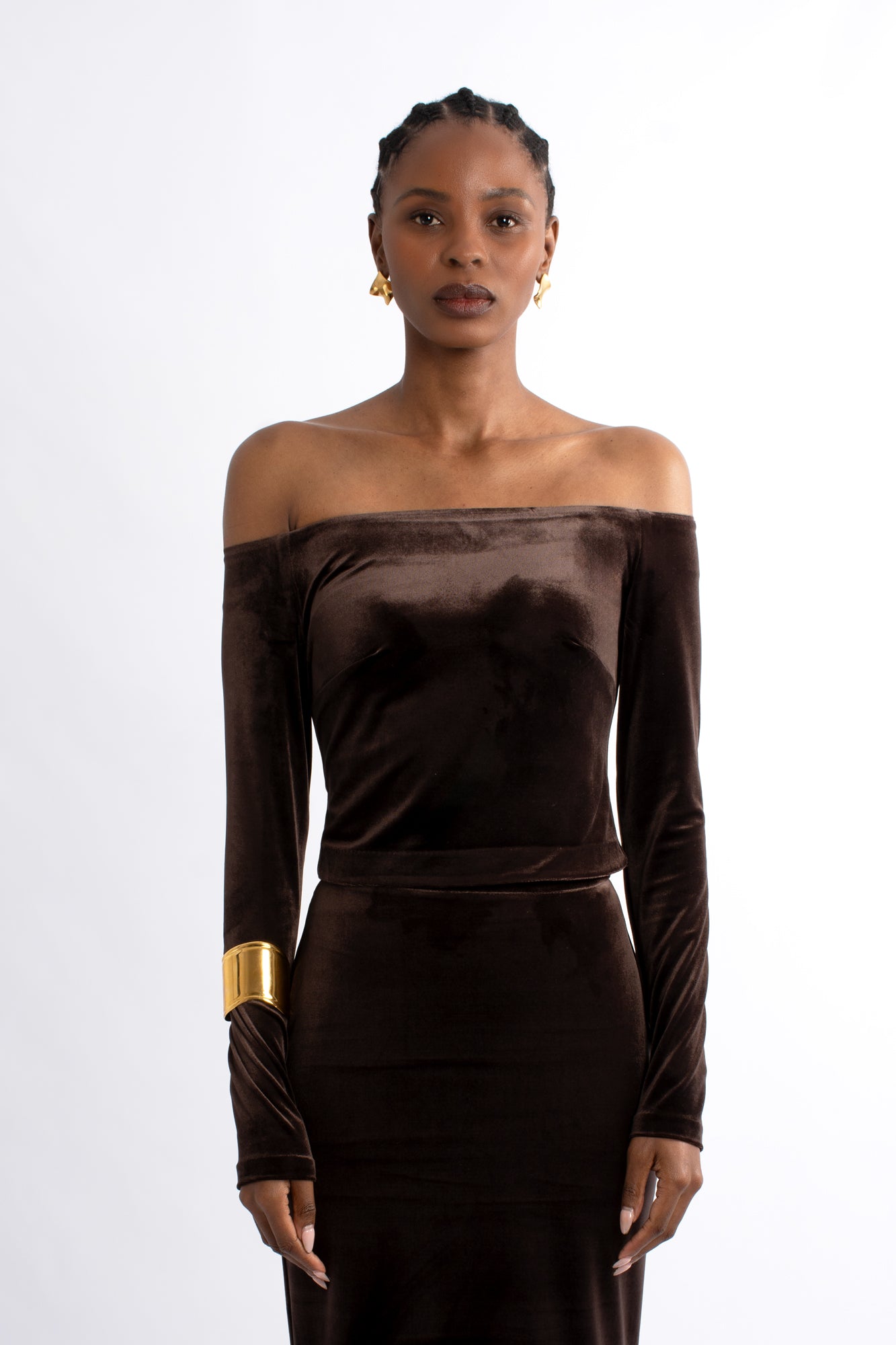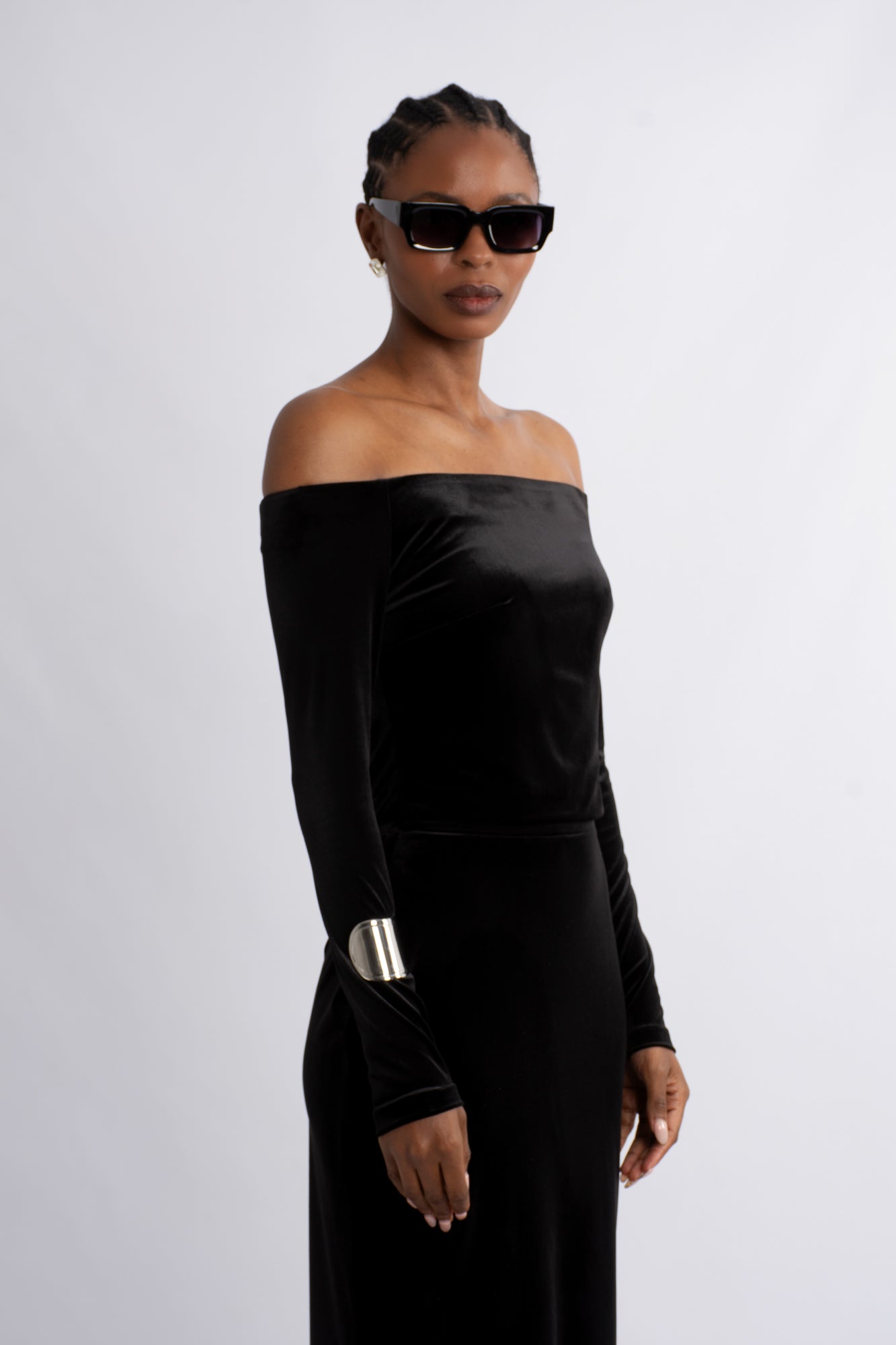 This fitted velvet top features an elegant off-the-shoulder design that highlights your neckline with subtle sophistication. Long sleeves and a slightly cropped length create a balanced silhouette, while the exposed metal zip at the back adds a modern, refined touch. Perfect for elevating any evening look with understated glamour.