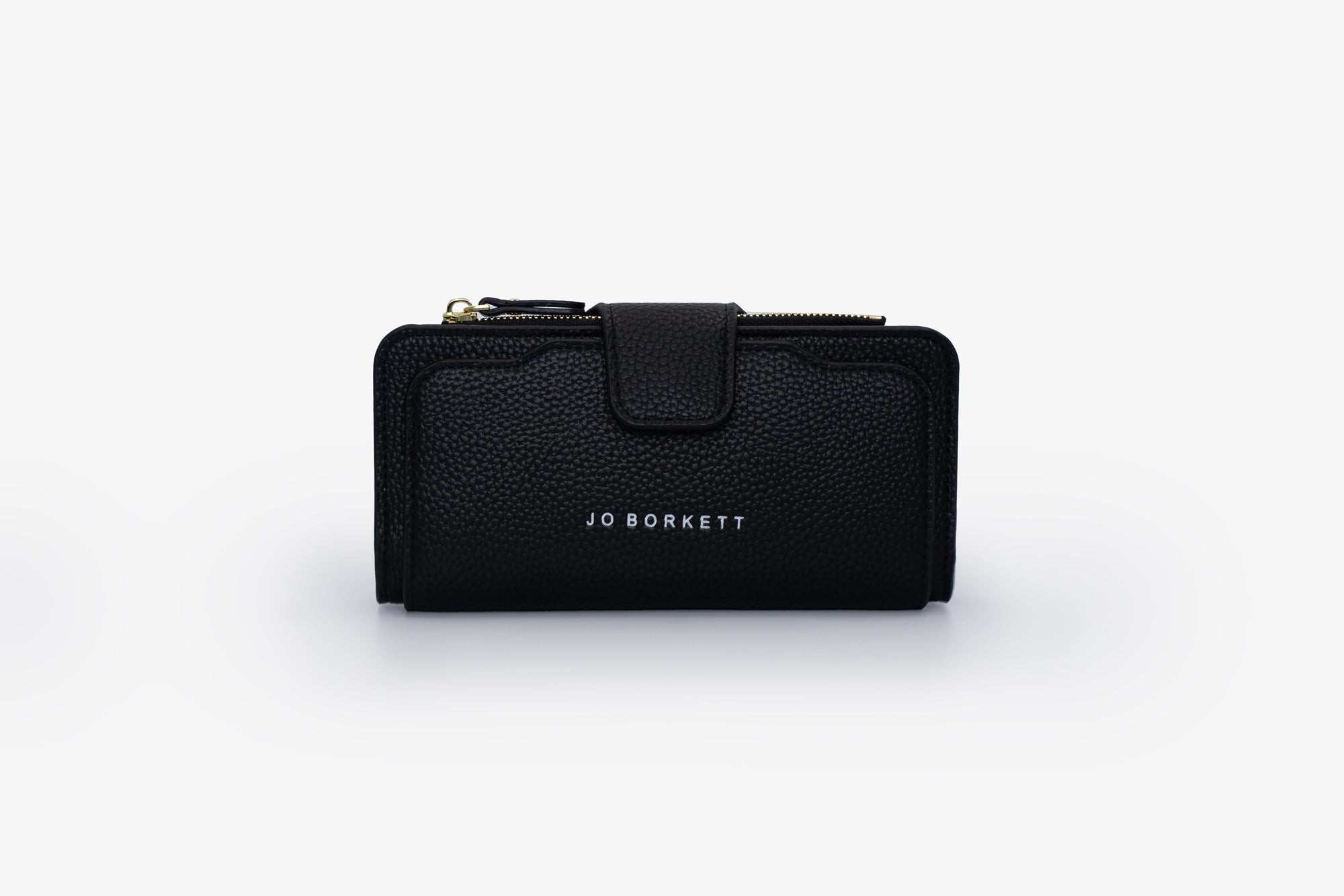 Faux leather surface embossed logo + printed wallet with gold hardware.